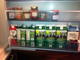Milk presents its own dilemma. Actually, I feel like I’m breaking up with the dairy department entirely, and it’s not going smoothly. For decades I’ve just assumed that whatever else is on my list, a couple of half gallons of skim should always come home with me. Open my sister Betsy’s fridge, and behold the tableaux of a house with children: homage to milk. When I was last there, she had nine half gallons of skim, a carton of whole and a pint of half and half.